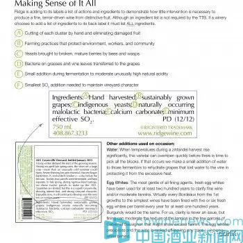 近些年,這一議題已引發了越來越大的爭議,一些葡萄酒零售商和釀酒師認為葡萄酒釀造時使用的一些“容易被人誤解”的成分被過多丑化。然而在2013年,加利福尼亞州葡萄酒生產商山脊酒莊(Ridge Vineyards)選擇了在其標簽上注明其葡萄酒中的所有成分,以促進酒標透明度以及不干預的做法。對此,山脊酒莊的釀酒師Paul Draper坦承,希望能通過此舉促成其它酒莊采取列明成分標簽的同樣做法。標簽上不僅包括葡萄酒中的每一項添加成分,還解釋了為何以及何時會添加清水、蛋清和酒石酸等成分。