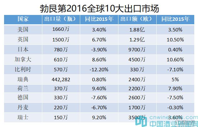 美國仍然是勃艮第葡萄酒最大的出口市場,緊接著是英國。勃艮第葡萄酒在英國和瑞典的出口量經歷2年的下滑后,于2016年重返上漲趨勢,但歐洲其他主要市場仍為下跌趨勢。