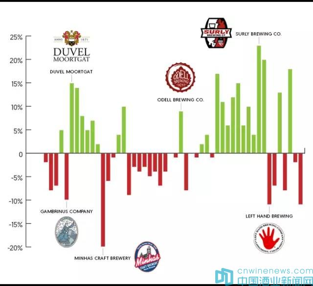 在2016年銷量有所增長其中包括Duvel Moortgat旗下的Firestone Walker,其銷量連續(xù)第三年增長30%以上。Bell's酒廠在2016年產(chǎn)量攀升至50萬桶,銷量同比增長了14%,達(dá)42萬桶。