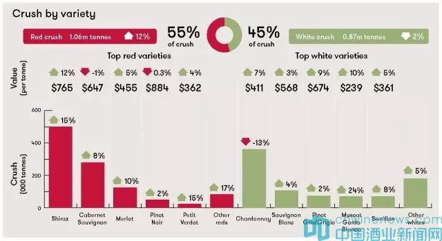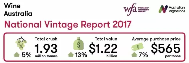 2017年收獲季,釀酒葡萄壓榨價值總額預計為12.2億澳元,將比2016年增長13%。2016年該數額為10.8億澳元。?