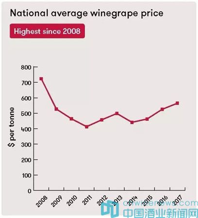 今年澳大利亞全國葡萄壓榨數量比去年上升5%,達到193萬噸。而澳大利亞全國葡萄的平均價格也上漲了7%,至565澳元每噸,這是自2008年以來平均價格的最高點。