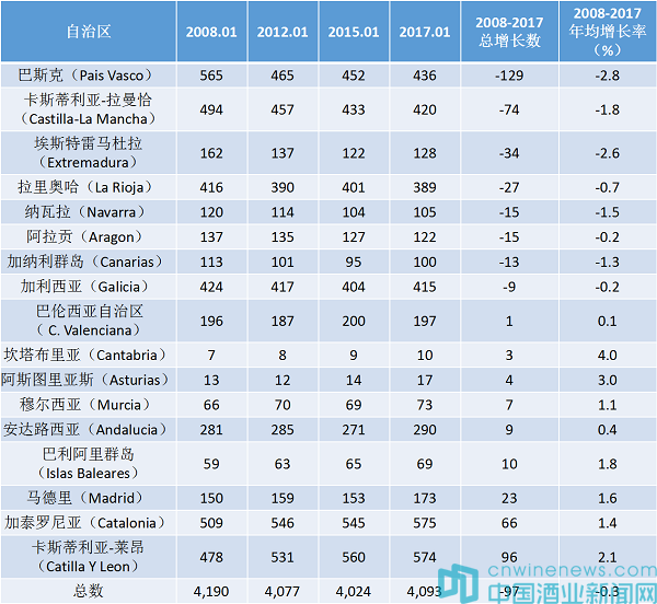 將這些數據與2008年份的統計數據對比,我們不難發現,在過去9年里,西班牙的酒莊數量總體而言減少了97家,年平均降幅為0.3%。其中,巴斯克自治區的酒莊數量下降最大,從2008年的565家減少為現在的436家,減少了129家。而卡斯蒂利亞-拉曼恰自治區和埃斯特雷馬杜拉(Extremadura)自治區的酒莊數量也分別減少了74和34家。相反地,卡斯蒂利亞-萊昂和加泰羅尼亞、馬德里(Madrid)等自治區的酒莊數量則略有增加,分別為96家、66家和23家,加泰羅尼亞更是躍居為西班牙酒莊數量最多的自治區。