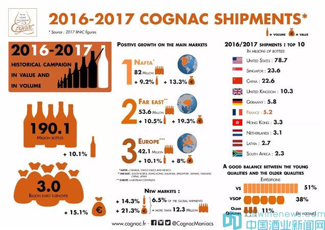 據法國國家干邑行業管理局數據顯示,干邑的出口數據在連續第三個年度里保持上升勢頭,2016-2017年度出口量增長10.2 %,出口額增長15.2 %,共計1.902億瓶,創收30億歐元。