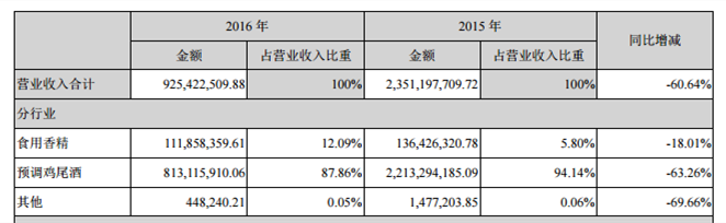 其中,預調雞尾酒2016年營業收入8.13億元,同期減少63.26%。主營業務收入占比較高的預調雞尾酒業務在消化經銷商庫存過程中,公司端產品出貨量顯著低于終端產品銷量,導致公司營業收入減少。
