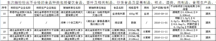本次監督抽檢的食品包括茶葉及相關制品、糧食加工品、其他食品、肉制品、食品添加劑、食糖、蔬菜制品、水果制品、速凍食品、糖果制品、調味品、飲料、餐飲食品、炒貨食品及堅果制品、糕點、酒類、食用農產品、食用油、油脂及其制品、保健食品19大類1231批次,抽樣檢驗項目合格樣品1197批次,不合格樣品34批次。其中酒類不合格4批次。