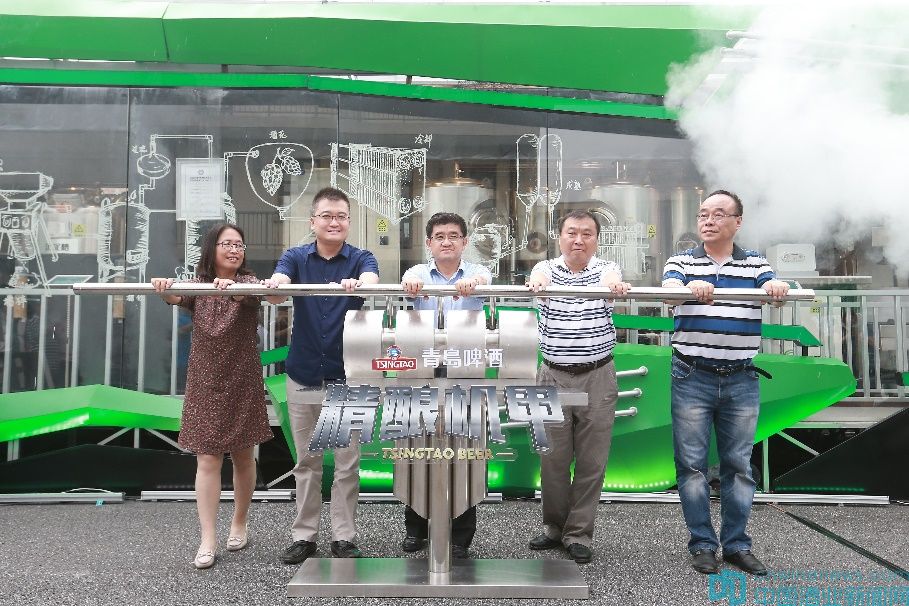 (圖說:青啤公司制造副總裁、國家級釀酒師董建軍(左三)啟動精釀機甲)