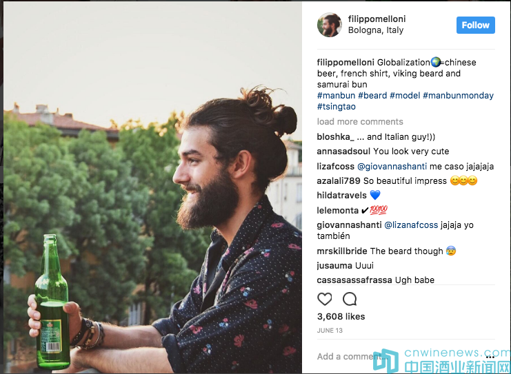 “Globalization=Chinese beer,French shirt,Viking beard and samurai bun”(全球化=中國啤酒,法國襯衫,維京胡子和日本發髻)。在照片分享應用Instagram上,意大利網友filippomelloni剛“po出”在自家陽臺與青島啤酒的親密照,瞬間“驚艷”朋友圈,收到好友3000多個好友點贊……