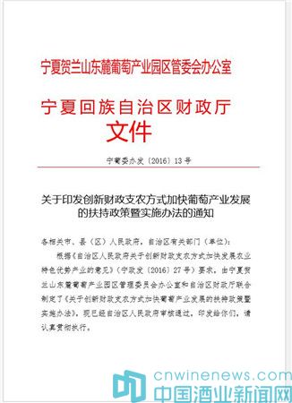 WBO獲悉,而上述展示中心的建立其實源于一份由寧夏賀蘭山東麓葡萄酒產業園區管委會辦公室與寧夏回族自治區財政廳聯合下發的文件——《關于印發創新財政支農方式加快葡萄酒產業發展的扶持政策暨實施辦法的通知》。