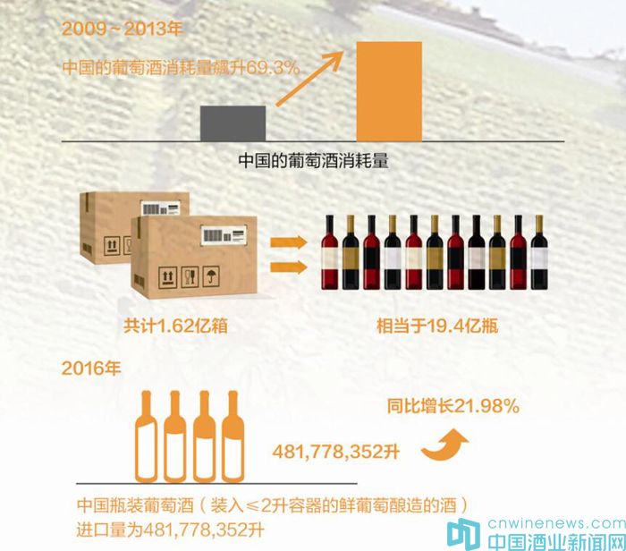 2009~2013年,中國的葡萄酒消耗量飆升69.3%,共計1.62億箱,相當(dāng)于19.4億瓶。2013年,全年人均葡萄酒消耗量達(dá)到1.4公升。2009~2013年,法國葡萄酒進(jìn)口至中國的總量大增3倍。