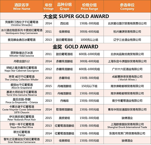 本次大賽獲得來自20多個國家,共計1000多款葡萄酒的報名,實際參賽酒款為928款。經過16位專家評委三天的專業品鑒,選出了230款獲獎酒款,其中大金獎3款,金獎23款,銀獎73款和優選獎131款。