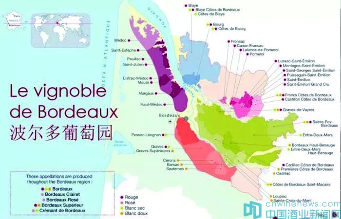 下面有兩條非常重要的河流,分別是加龍河和多爾多列河,兩條河匯合之后,到了吉論特河,河流給當(dāng)?shù)赜辛撕芏嗟臎_積地出來,所以在沖擊地的平原上長出了波爾多葡萄品種,釀出了波爾多葡萄酒。沖擊土壤上面有好多粒質(zhì)性的土壤,還有石灰質(zhì)的土壤,這類型的土壤可以對葡萄起到一個加溫性的作用。也是因為這個原因,像我們剛才說的梅樂和赤霞珠這兩類葡萄品種可以一直種植在如此偏北的地區(qū)。波爾多葡萄園另外一個特點就是它的所在地就在海邊,大家可以從上圖很清晰的看出來,左邊就是大西洋。從波爾多葡萄園去海邊只有30公里,對于中國如此幅員廣闊的面積而言,30公里真心只是一根頭發(fā)絲了。