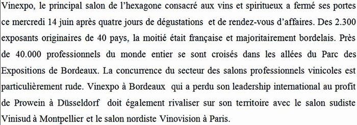 面對杜塞爾多夫的國際葡萄酒及烈酒展覽會(ProWein)的崛起,波爾多的Vinexpo已經失去了在國際上領導行業發展的絕對優勢。同時,波爾多的Vinexpo展會還要面對南方來自蒙彼利埃舉辦的南部葡萄酒展覽會(Vinisud)和在北方巴黎舉辦的葡萄酒視野展覽會(Vinovision)所帶來的競爭壓力。