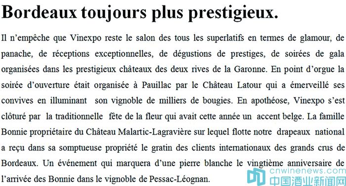 即使有了德國酒展ProWein的崛起,也阻擋不了Vinexpo在葡萄酒會展界最高檔次酒展的地位。Vinexpo就好比葡萄酒界的《Glamour(魅力)》和《Panache(彩翎)》雜志(兩種出名的時尚雜志),其優質的服務、上乘的品酒會以及在加隆河(Garonne)兩側的古堡中舉辦的最有聲望的葡萄酒晚宴,這些都是無法替代的。再進一步來看,Vinexpo的晚間開幕式是在波亞克產區(Pauillac)的拉圖(Latour)酒莊舉行的。在那里,主人用上千只蠟燭把整個葡萄園照耀得通明透亮,讓賓客們著實驚嘆了一番。至于最后精彩的壓軸戲,今年Vinexpo的閉幕式采用了以比利時為主題的傳統鮮花節。Malartic-Lagravière酒莊的主人 ——Bonnie家族在他們奢華的優質莊園上搖動著法國國旗,接待來自世界各地的社會名流。他們用這場活動紀念和慶賀Bonnie家族開拓Pessac-Léogan的葡萄園以來的第20個年頭。