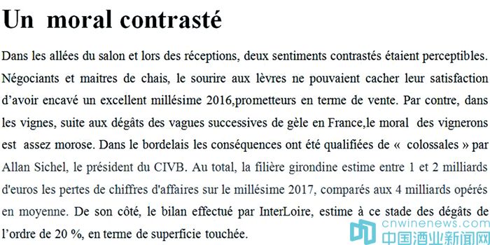 總體來看,僅吉倫特產區,預計2017年年份酒的銷售額將會有10億~20億歐元的滑坡,這是相對于上一年平均40億歐元的銷售額而言。而InterLoir的分析數據則顯示冰災所造成的損害波及了20%的葡萄園。