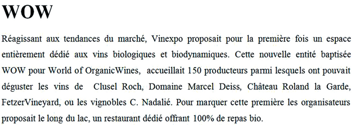 為適應市場發展趨勢,Vinexpo第一次開辟了一片展區專供有機生產和生態動力法釀制的葡萄酒展示。這個全新的展區被命名為WOW (Word Organic Wines)——有機葡萄酒世界。在這里有150位生產商參展,人們可以品嘗到來自Clusel Roch、Domaine Marcel Deiss、Chateau Roland la Garde、FetzerVineyard或是les vignobles C. Nadalié等莊園的葡萄酒。為了突出這是第一次針對有機葡萄酒進行宣傳,組織方還通過一個餐館,沿湖展開,致力于為人們提供100%的純天然綠色飲食。