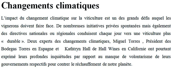 全球氣候變化對釀酒葡萄種植業發展所帶來的影響是葡萄種植商們需要面臨的巨大挑戰,不論是私營業主自發主動采取的防御措施,還是來自地區或是國家的政令都在日漸為保障釀酒葡萄種植業的《可持續性》發展而努力。來自西班牙Bodegas Torres公司的Miguel Torres和來自加州Hall Wines公司的Kathtryn Hall,這兩位研究氣候變化方面的專家向大家表示他們各自的政府缺乏自愿對抗全球氣候變暖意識的憂慮。