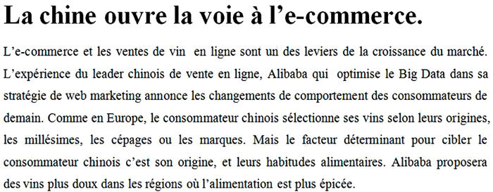 電子商務和在線銷售都是葡萄酒市場發展的重要支柱。阿里巴巴,在線銷售經驗最豐富的中國電商領導企業,在他們的網絡市場策略上不斷優化大數據發展,并宣稱消費者的消費行為方式將在未來得到改變。就像在歐洲一樣,中國消費者選擇葡萄酒時會注重其原產地、年份、葡萄品種或品牌。然而,最能準確定位中國消費者決定性因素的還是葡萄酒的原產地和他們習慣性的飲食結構。阿里巴巴將向飲食結構中口味濃郁地區的人們推薦口味相對柔和的葡萄酒。