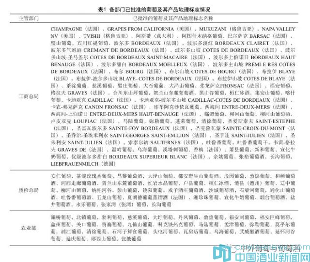 1.1 各部門對葡萄及其產品地理標志的認定情況