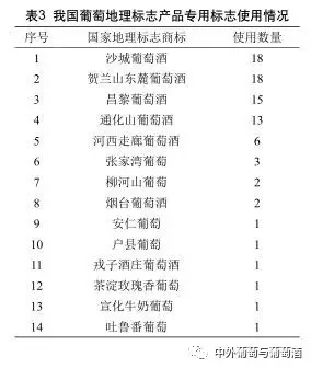 為了維護地理標志的合法權益,可合法使用地理標志專用標志。截止2015年年底,我國質檢總局共核準了83家企業對14項葡萄及葡萄酒地理標志的使用。由表3可知,我國葡萄及葡萄酒地理標志產品專用標志使用較好的包括安仁葡萄、戶縣葡萄、戎子酒莊葡萄酒等14項(占我國葡萄地理標志總件數的14.74%)其余的使用企業數均為0。