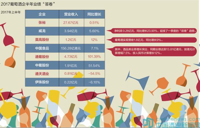 8月31日,在港交所上市的中國食品發布半年報顯示,其整體營業收入為156.28億港元,同比增長約7.1%。其中,酒品類業務增長突出,同期業績達到13.81億港元,按港元計算增長7.5%,按人民幣計算增長12%。酒品類利潤為4.18億港幣,去年同期僅為1.10港幣,增長約277.7%。但是,由于低端產品銷售收入大幅下滑22.9%,導致長城葡萄酒按照人民幣口徑整體銷售收入下降8%。而中國食品董事總經理則在報告中指出,2017年宏觀經濟運行平穩,但酒類行業景氣度不高,行業內部競爭激烈。
