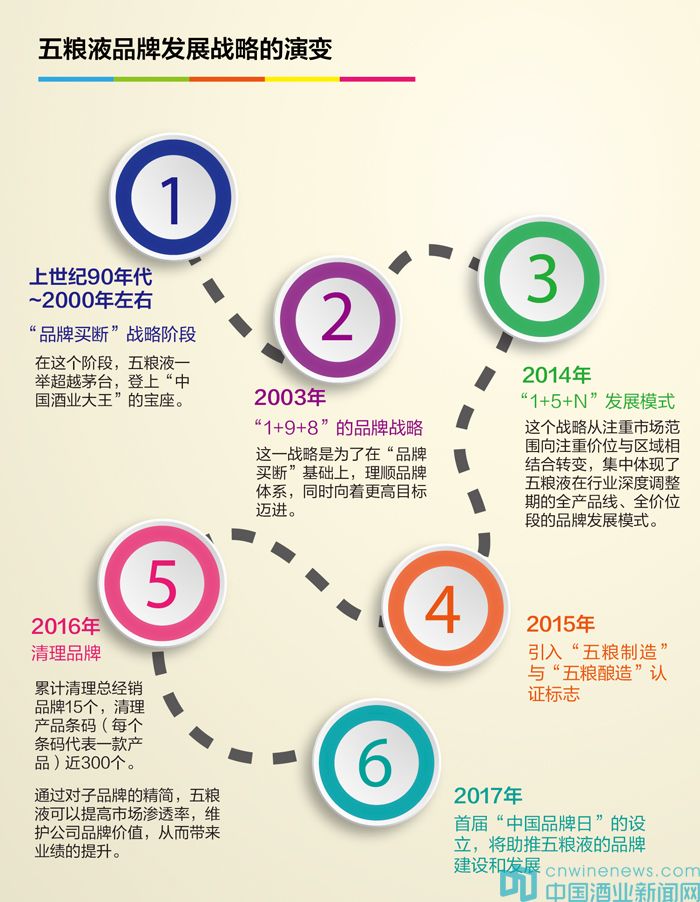 在“1+9+8”品牌戰略的基礎上,2014年7月18日五糧液股東大會決議提出,構建“1+5+N”發展模式,要求從注重市場范圍向注重價位與區域相結合轉變,推動公司快速恢復發展。“1+5+N”發展模式為:“1”是高端產品“五糧液”;“5”是中低檔產品——五糧醇、五糧春、五糧特頭曲、綿柔尖莊、六和液,重點打造這5個品牌,做穩、做實市場;“N”是指其他區域性代表品牌。這個戰略集中體現了五糧液在行業深度調整期的全產品線、全價位段的品牌發展模式。