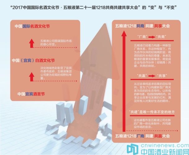 11月21日,五糧液公司在“中國國際名酒文化節(jié)”新聞發(fā)布會上宣布,“2017中國國際名酒文化節(jié)·五糧液第二十一屆1218共商共建共享大會”將于12月18日—20日在四川宜賓舉行。細心的粉絲們發(fā)現(xiàn),“中國(宜賓)白酒文化節(jié)”名稱已經(jīng)改為“中國國際名酒文化節(jié)”,此前的“廠商共建共贏大會”更名為“共商共建共享大會”。