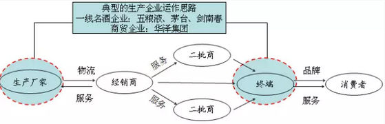 “在商言商”,以商貿單元為基礎的酒水產業鏈條,主要由三個環節構成,分別是上下游關系的生產企業單元、商貿企業單元和銷售終端單元。商貿企業的產業鏈價值思考,就是由商貿單元向生產單元與終端單元的不斷整合推進。