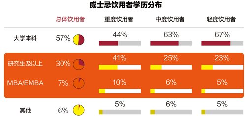 在威士忌飲用者中,高學(xué)歷者和企業(yè)家是威士忌的重要目標(biāo)人群,在職業(yè)背景上,威士忌“適合商務(wù)應(yīng)酬”的產(chǎn)品屬性使得商業(yè)環(huán)境中越成功關(guān)鍵的人物,飲用體驗(yàn)越多。重度飲用者中企業(yè)家(包括一代和二代)的比例為41%,顯著高于中度飲用者的24%和輕度飲用者的21%。