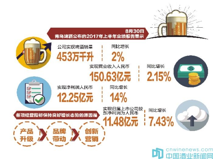 8月30日晚間,青島啤酒股份有限公司公布的2017年上半年業(yè)績報(bào)告顯示,公司實(shí)現(xiàn)啤酒銷量453萬千升,同比增長2%;實(shí)現(xiàn)營業(yè)收入人民幣150.63億元,同比增長2.15%;實(shí)現(xiàn)凈利潤人民幣12.25億元,同比增長14%;實(shí)現(xiàn)歸屬于上市公司股東的凈利潤為人民幣11.48億元,同比增長7.43%。