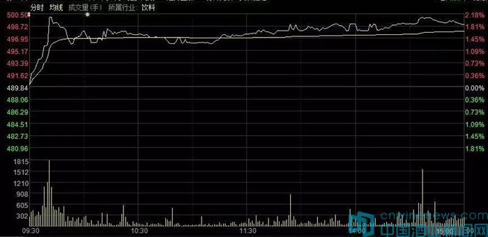 今日兩市小幅低開,開盤后白酒板塊率先走高。貴州茅臺以490.14元開盤,隨后快速拉升,9點(diǎn)41分就突破500元大關(guān),觸及500.5元。隨后在498元附近震蕩。14點(diǎn)36分時,貴州茅臺再度觸及500元,此后小幅回落,最終以498.97元收盤。