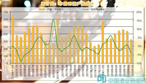 2018年9月,中國規模以上啤酒企業產量323.8萬千升,同比下降3.9%;2018年1~9月,中國規模以上啤酒企業累計產量3266.3萬千升,同比增長0.3%(注:規模以上啤酒企業起點標準為年主營業務收入2000萬元)。