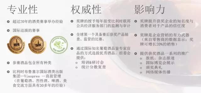 比利時布魯塞爾國際葡萄酒大獎賽是首個對獲獎酒品進行賽后資格確認的國際酒類賽事。賽后,由官方化學實驗室和釀酒專家會對參賽的獲獎酒品進行抽樣對比測試,確保市場銷售的產(chǎn)品同獲獎產(chǎn)品的一致性。