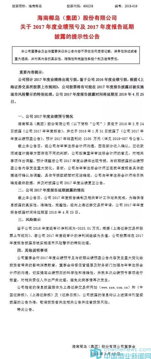 海南椰島(600238)3月12日晚間公告,經(jīng)公司與年審注冊(cè)會(huì)計(jì)師溝通,因在部分收入確認(rèn)、應(yīng)收款項(xiàng)減值計(jì)提等方面存在不同的判斷,公司擬尊重年審注冊(cè)會(huì)計(jì)師的意見,對(duì)相關(guān)事項(xiàng)作出調(diào)整,預(yù)計(jì)調(diào)整后公司2017年度業(yè)績(jī)將出現(xiàn)虧損,與前期披露的業(yè)績(jī)預(yù)盈公告內(nèi)容發(fā)生重大變化。若公司2017年凈利潤(rùn)繼續(xù)為負(fù)值,公司股票將被實(shí)施退市風(fēng)險(xiǎn)警示的特別處理。此前公司預(yù)計(jì)2017年將盈利約2100萬元。