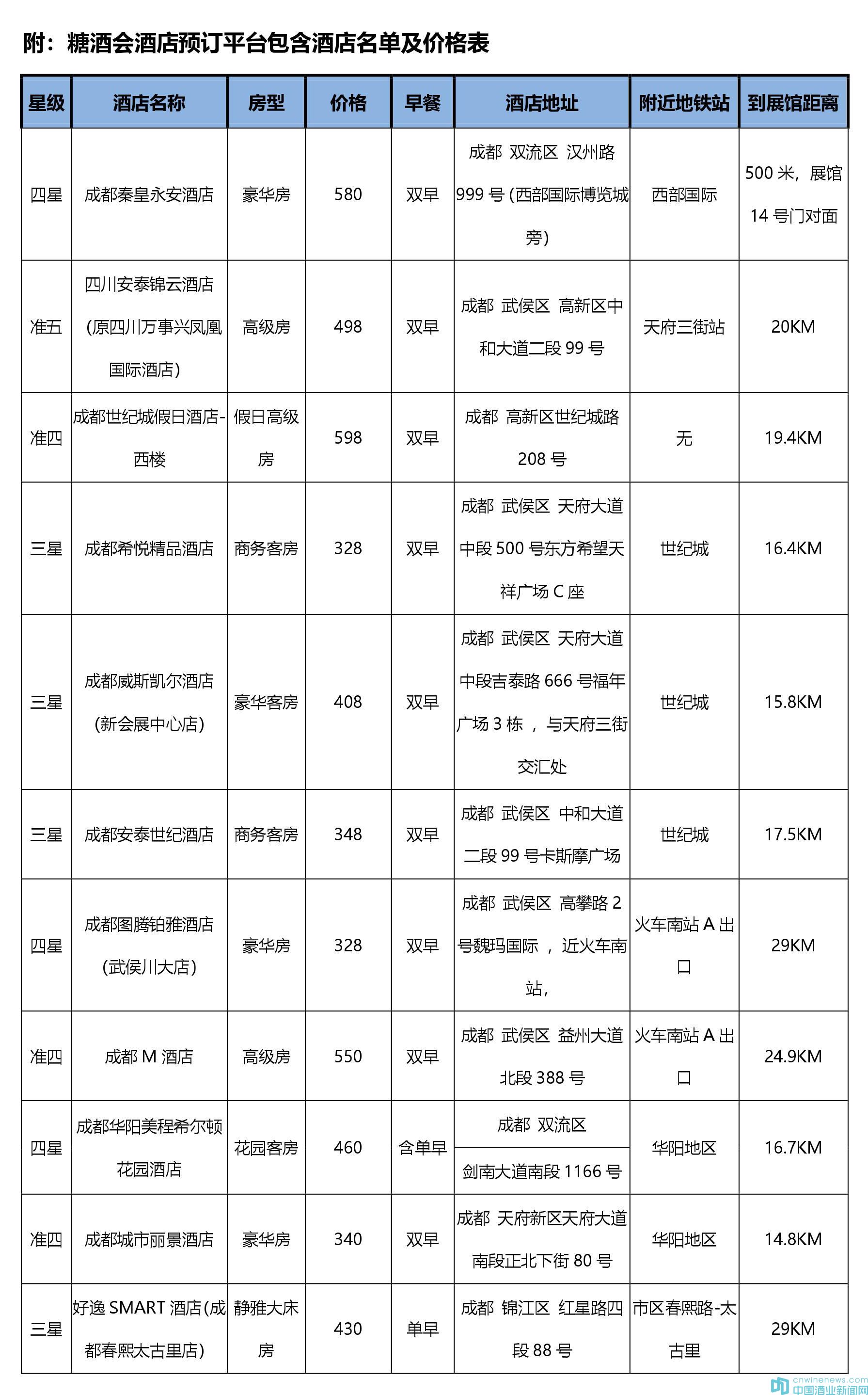 在綜合考量西博城周邊酒店的地理位置、酒店資質、住宿環境、客房數量及價格等各因素后,糖酒會酒店預訂平臺最終上線了15家酒店,涵蓋從經濟型酒店至五星酒店等多個規格,并推出中英文兩個版本的登錄入口,可以滿足不同人群的商務洽談、休閑度假等出行需求。