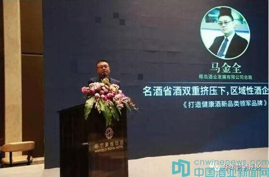 椰島酒業發展有限公司總裁馬金全先生做了題為《打造健康酒新品類領軍品牌》的主題演講。他首先對當前整個行業的形勢和趨勢發表了個人看法和觀點,那就是行業集中度加速提高,市場競爭日益激烈,整個行業呈現向龍頭集中的基本態勢。同時他認為健康消費理念下消費需求的快速擴張、悠久的歷史下我國保健酒滋補養生功效早已深入民心、保健酒行業規模小,成長空間巨大這三大因素將推動保健酒行業實現快速發展。在具體保健酒的操作思路上,他提出如何以品類的思維重新定義健康酒,如同通過精細化的營銷來為市場的有質量發展助力的系統性分享。