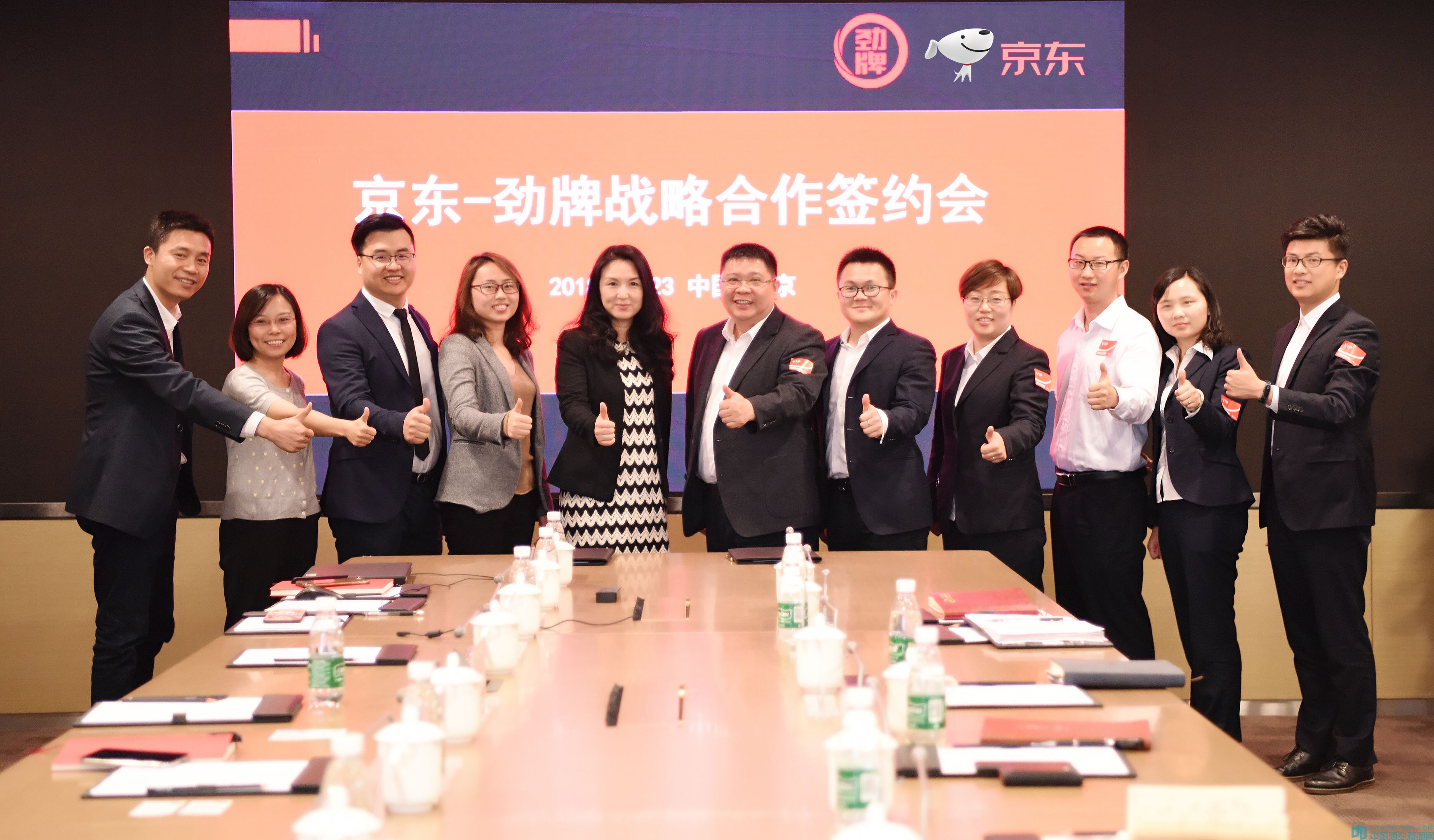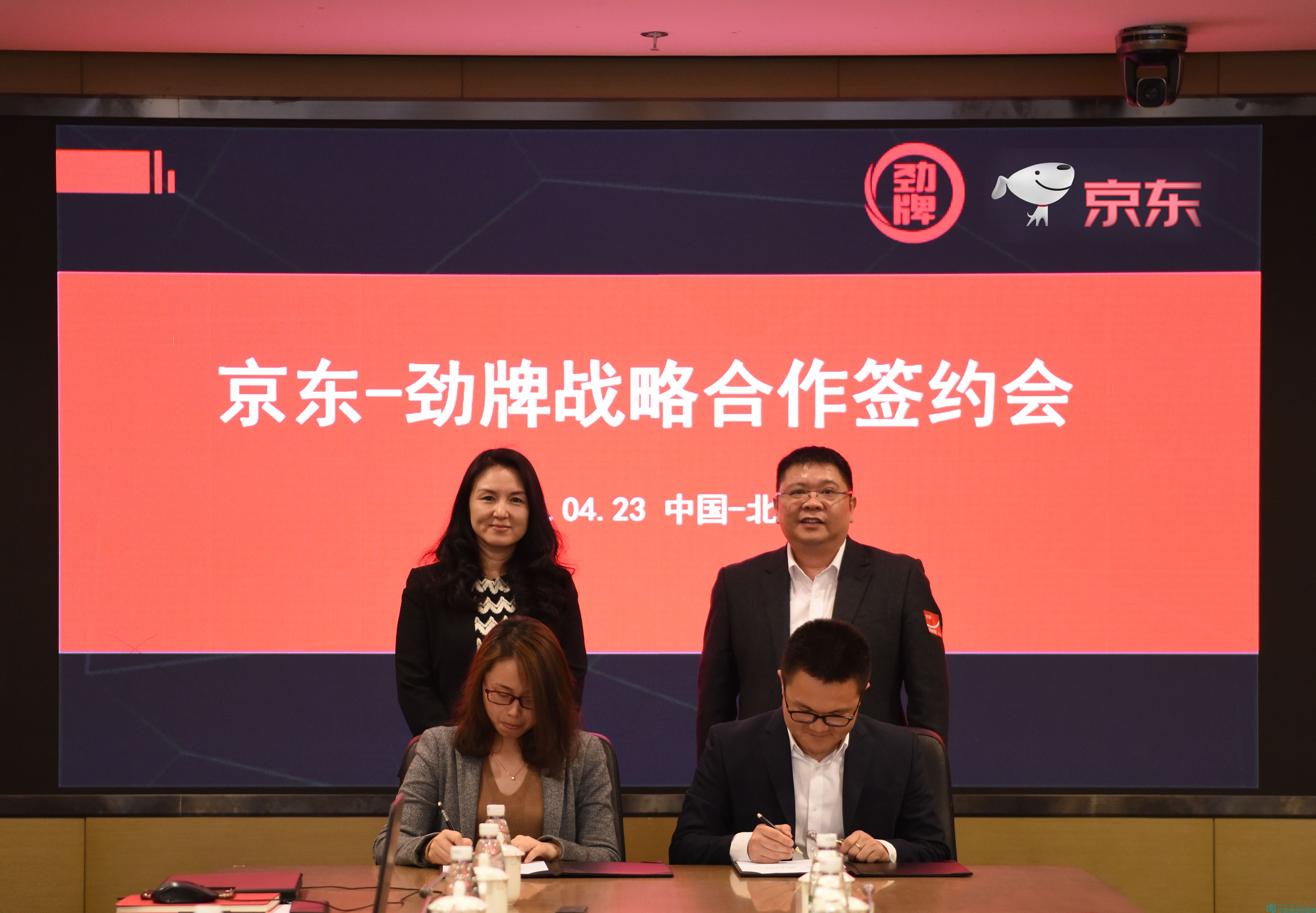 4月23日,勁牌有限公司與京東集團在北京正式簽訂戰略合作協議。勁牌公司副總裁王楠波、京東集團副總裁馮軼、勁牌公司互聯網事業部總經理王軍、京東集團大快消事業群總經理吳雙喜等雙方領導一同參加簽約儀式。