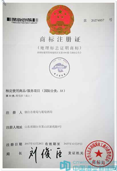 記者了解到,為了維護和提高“煙臺葡萄酒”在國內外市場上的良好信譽,促進煙臺葡萄酒產業健康發展。建局之初,煙臺市葡萄與葡萄酒局就開始籌備這項工作。2016年正式進入申辦程序,2017年年內正式啟動,年末完成初審公示和正式發布。2018年初,領取到了商標注冊證。