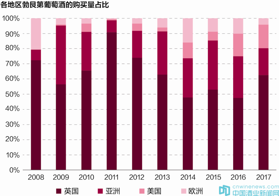 目前,Liv-ex約20%的會員位于亞洲,但他們占到該平臺勃艮第酒交易額的20%~30%。2017年,這一比例有所降低,因為英鎊貶值,英國酒商借機屯貨。當然,英國酒商也并非僅賣給英國人,其中相當一部分流入了其他國家。