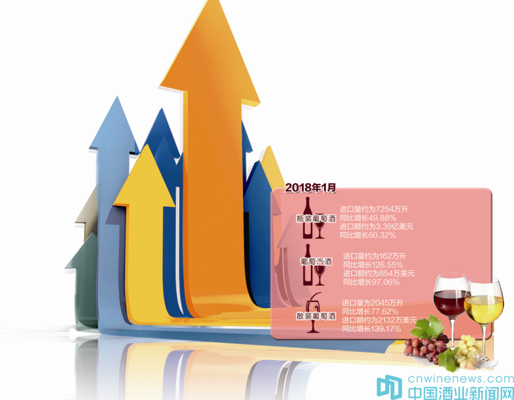 隨著中國經濟的發展以及居民收入水平的不斷提高,消費年輕化、需求多樣化、品質高端化的消費需求越來越明顯。2017年進口葡萄酒“蒸蒸日上”,雖然瓶裝酒、起泡酒、散裝酒在開局并不理想,但全年總體來說仍呈現出上升態勢。進入2018年,進口葡萄酒漲勢強勁,取得開門紅。據最新數據統計,2018年1月,葡萄酒進口總量約為9522萬升,同比增長56.55%;進口額約為3.71億美元,同比增長64.73%,比2017年1月進口總量6094萬升的平淡開局增長不少。