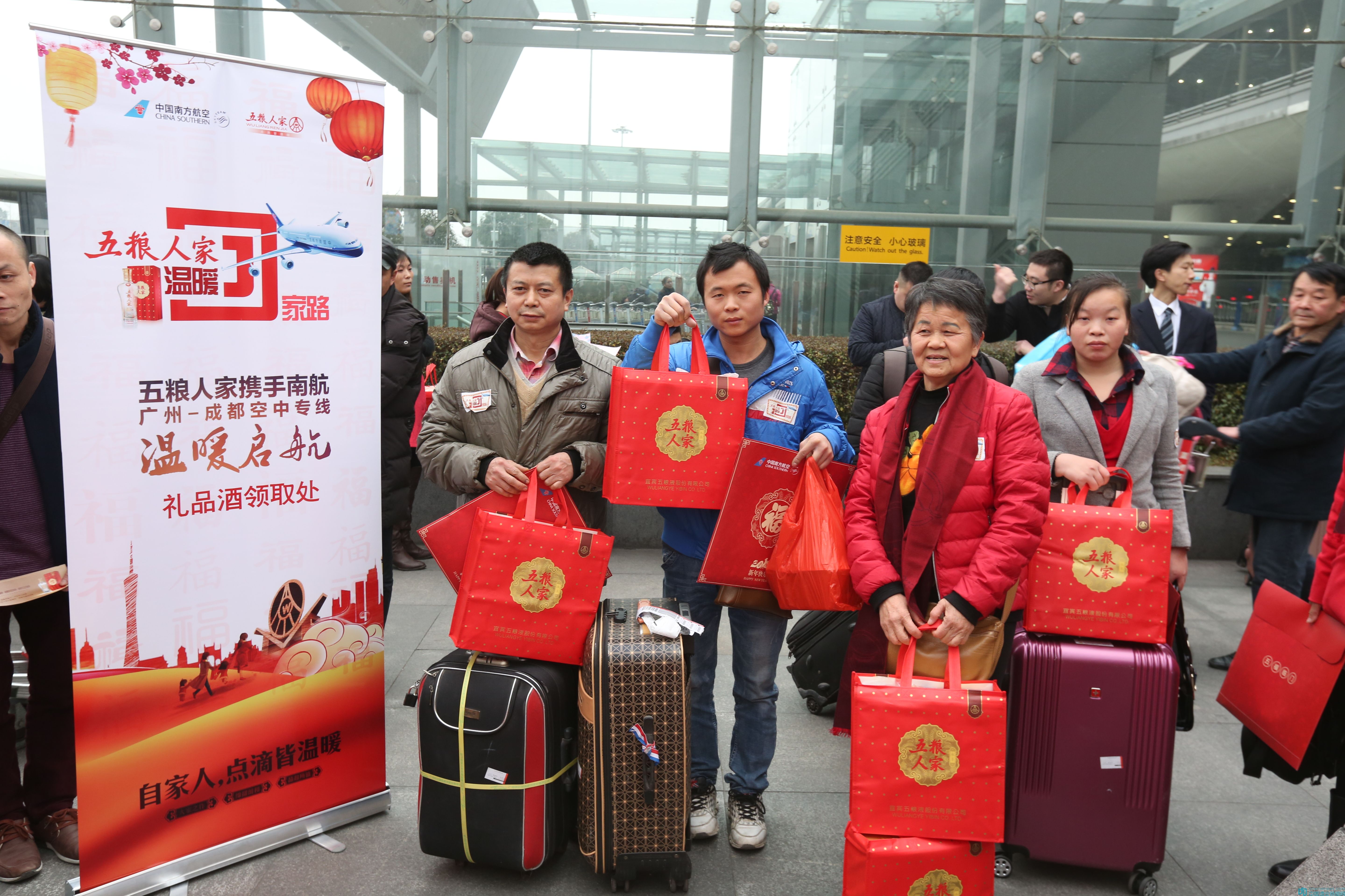 經過一路的歡歌笑語,下午16:00左右,這架滿載著溫暖情誼的航班徐徐降落在四川成都雙流機場。當歸鄉的游子們面帶喜色地陸續走出飛機后,映入眼簾的,是早早等候在機場的五糧人家的領導們。他們為遠道歸來的老鄉們獻上鮮花和五糧人家定制的圍巾,歡迎他們回家。走出機場后,五糧人家還為每一位老鄉準備了兩瓶五糧人家酒,作為新年祝福。