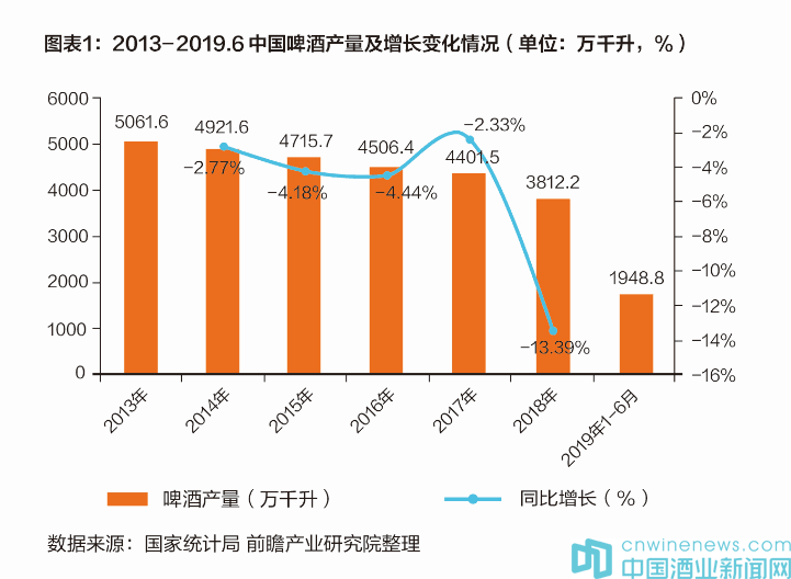 2016年~2018年啤酒行業(yè)產(chǎn)量略有下降,短期是受餐飲景氣度及氣溫等影響。我國(guó)啤酒行業(yè)產(chǎn)量2014年首次出現(xiàn)下滑,2015年大幅下降5.1%,2016~2018年三年增速分別為-0.1%、-0.7%、0.5%,均在0%左右波動(dòng),未來(lái)啤酒行業(yè)的量將保持相對(duì)穩(wěn)定。短期來(lái)看,受益于餐飲行業(yè)復(fù)蘇及氣候同比回暖,2019年1~2季度全國(guó)啤酒產(chǎn)量有所增長(zhǎng)。據(jù)中商產(chǎn)業(yè)研究院最新數(shù)據(jù)顯示,2019年6月全國(guó)啤酒產(chǎn)量為440.1萬(wàn)千升,同比增長(zhǎng)4.5%。2019年1~6月全國(guó)啤酒產(chǎn)量為1948.8萬(wàn)千升,同比增長(zhǎng)0.8%。