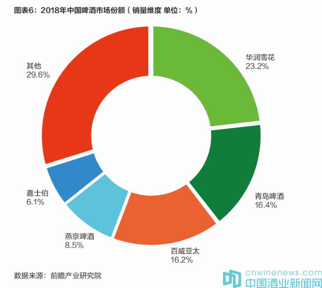目前,我國(guó)啤酒市場(chǎng)主要品牌為華潤(rùn)雪花、青島啤酒、百威英博、燕京啤酒以及嘉士伯,五大品牌合計(jì)市場(chǎng)份額達(dá)到70%以上,行業(yè)集中度較高。數(shù)據(jù)顯示,2018年,華潤(rùn)雪花占據(jù)了23.2%的市場(chǎng)份額,居首位;其次為青島啤酒和百威亞太,市場(chǎng)份額在16%以上;五大品牌以外的中小品牌瓜分剩下近30%的市場(chǎng)份額。
