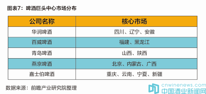 就目標(biāo)各個(gè)品牌在全國(guó)市場(chǎng)的分布來(lái)看,呈現(xiàn)出明顯的地域割據(jù)特征,行業(yè)龍頭企業(yè)均雄踞一方。例如華潤(rùn)啤酒在四川、遼寧和安徽等市場(chǎng)市占率均達(dá)到60%以上;青啤在山東、陜西;百威在福建和黑龍江;燕京在北京、內(nèi)蒙古和廣西;嘉士伯在新疆、寧夏、重慶、云南等。