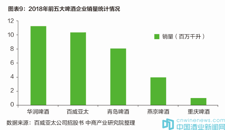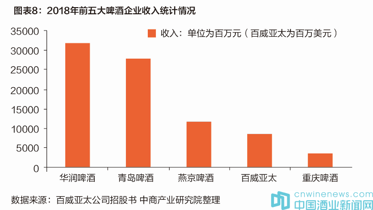 目前,國(guó)內(nèi)啤酒五巨頭分別為華潤(rùn)啤酒、青島啤酒、燕京啤酒、百威亞太以及重慶啤酒。其中,華潤(rùn)2018年收入高達(dá)318.67億元,是五大巨頭中收入最高的啤酒巨無(wú)霸。