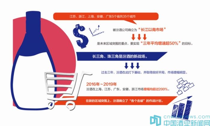 江蘇、浙江、上海、安徽、廣東5個省共35個城市,被汾酒公司確立為“長江以南市場”,是未來區(qū)域突圍的重點(diǎn),要實(shí)現(xiàn)“三年平均增速超50%”的目標(biāo)。