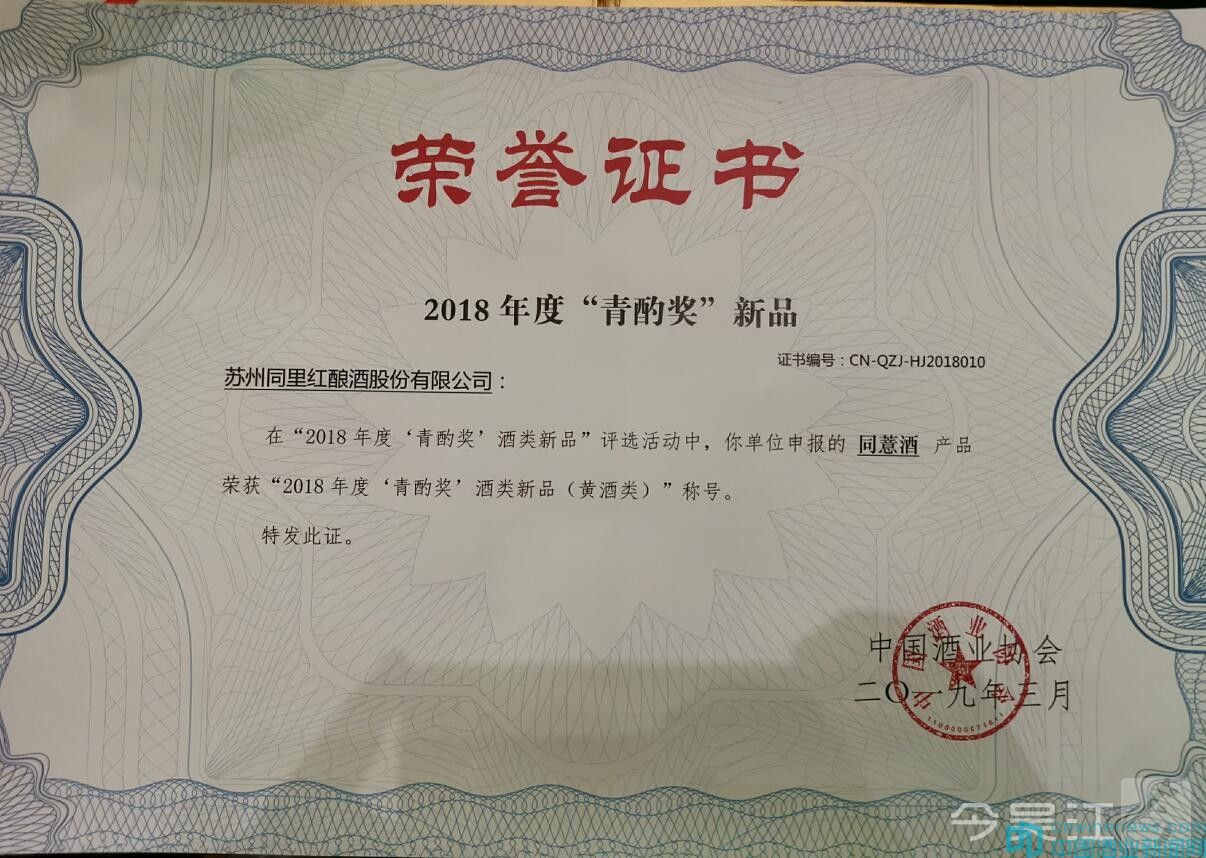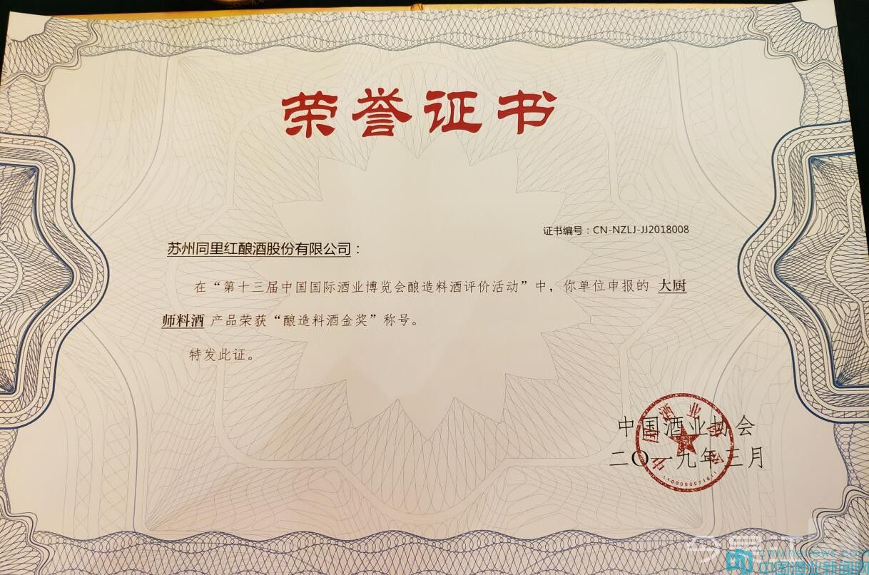 3月24日-27日,第十三屆中國國際酒業(yè)博覽會在四川省瀘州成功舉行。在其間舉行的2018年度酒類新品發(fā)布盛典上,來自江蘇蘇州同里紅釀酒股份有限公司生產的同薏酒在中國酒業(yè)協(xié)會最高獎“青酌獎”評選中,獲得“2018年度‘青酌獎’酒類新品(黃酒類)”稱號,大廚師料酒獲得“釀造料酒金獎”稱號。
