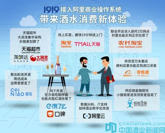 事實上,阿里巴巴早與1919探索了酒飲新零售革命,并已在天貓、淘寶、零售通、菜鳥、餓了么、口碑、螞蟻金服、阿里云等多條業務線,展開了供應鏈、倉儲配送、金融、數據資源等領域的深度合作,阿里巴巴商業操作系統的大圖正在酒水行業徐徐展開。