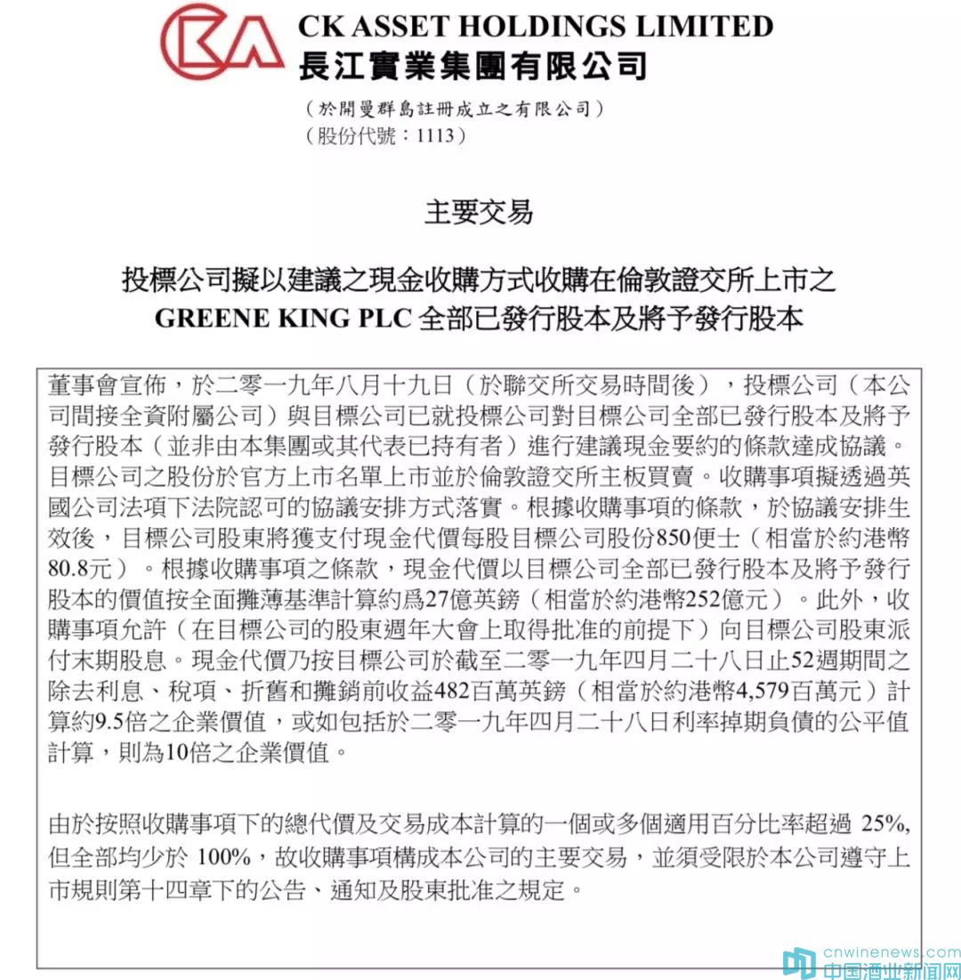 8月19日晚,由李嘉誠家族掌舵的長江實業集團有限公司發布公告稱,公司的間接全資附屬公司CK Noble(UK) Limited以27億英鎊(相當于約231億人民幣)收購Greene King plc(格林王)全部已發行股本及將予發行股本,并支付現金承擔Greene King 19億英鎊(合163億人民幣)的債務。