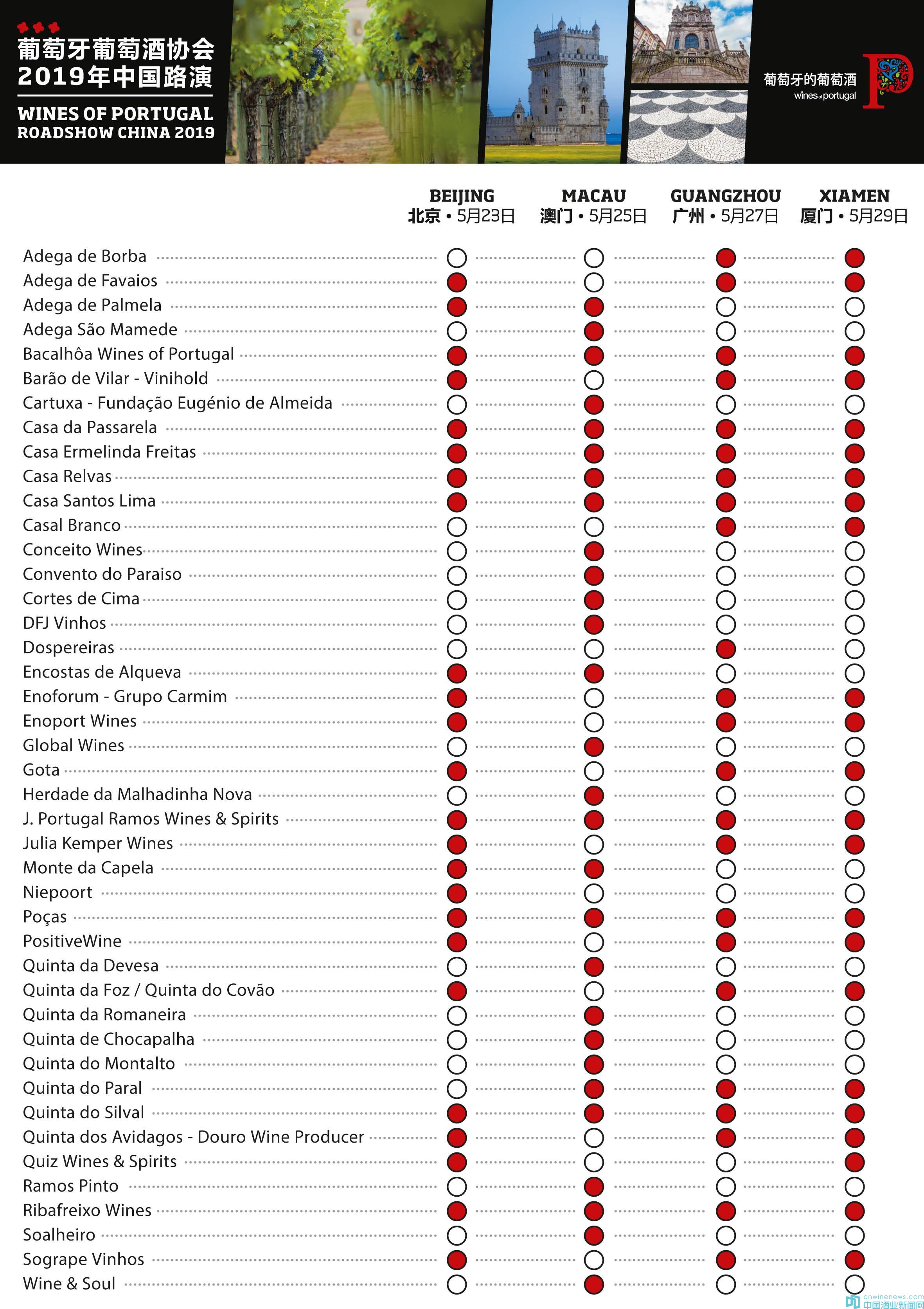 2019年中國(guó)路演將于5月23日至29日在北京、澳門、廣州和廈門舉行。屆時(shí),來(lái)自葡萄牙的40多家酒商將攜帶超過(guò)200款紅葡萄酒、白葡萄酒、起泡酒以及加強(qiáng)型葡萄酒供來(lái)賓品鑒,酒品覆蓋葡萄牙14大葡萄酒產(chǎn)區(qū)。