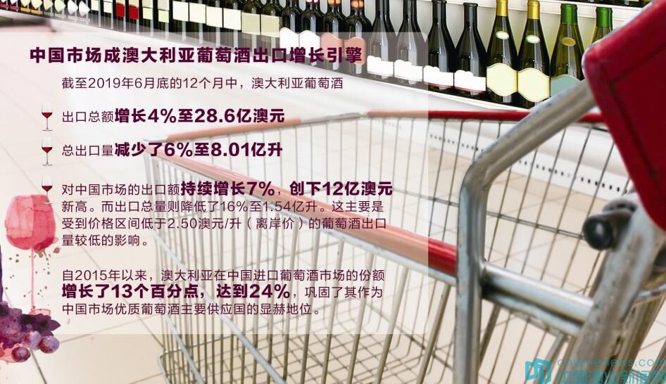 截至2019年6月底的12個月中,澳大利亞葡萄酒的出口總額增長了4%至28.6億澳元。其中,對中國市場的出口額持續增長7%,創下12億澳元新高。此外,對主要市場美國的出口也重新步入增長軌道。